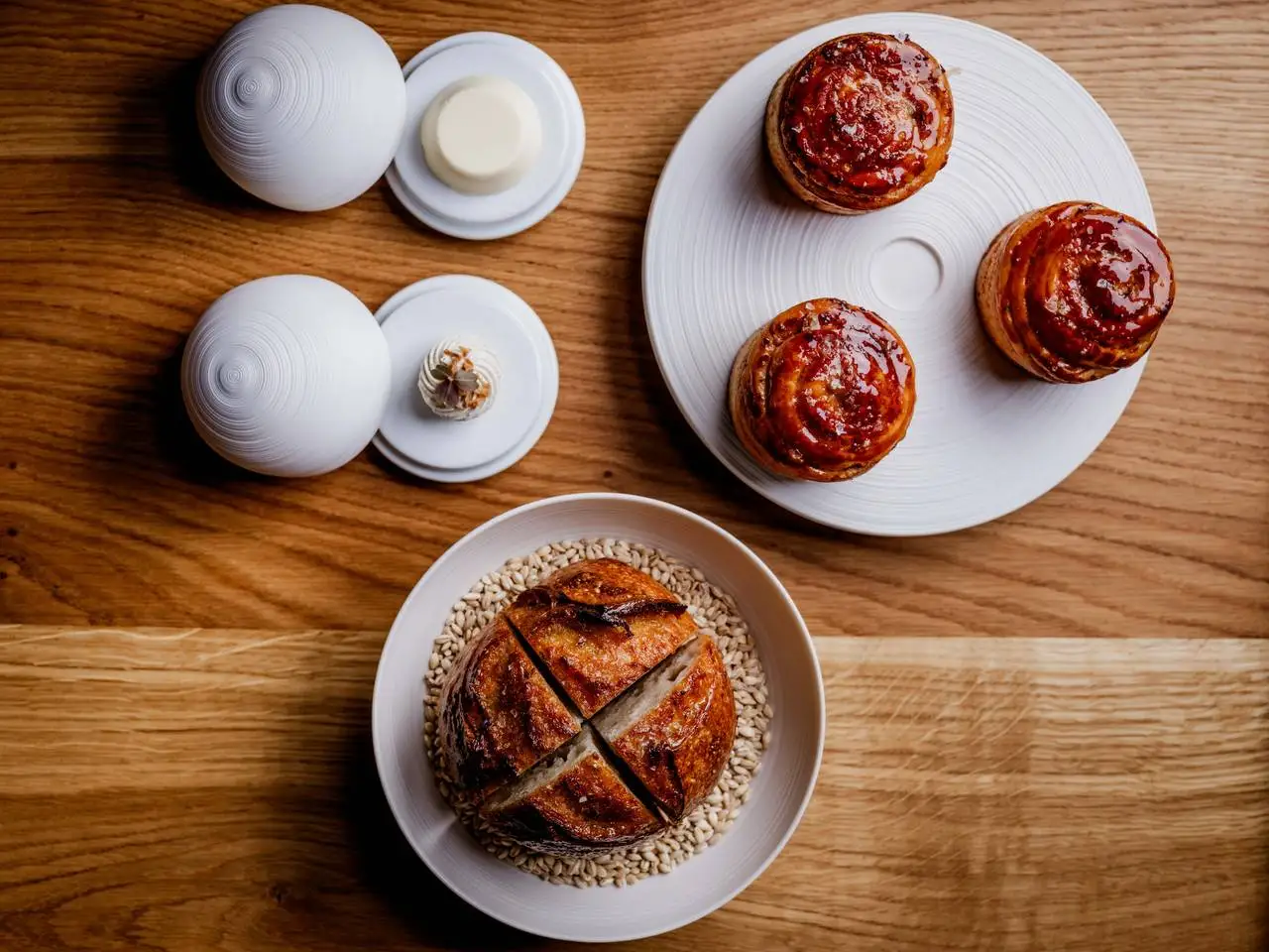 سپس نان آمد: یک بریوش لایهای با پیاز کاراملیشده، آویشن و برگ کاری که با کره قهوهای براق شده بود و یک نان ترش که با رزماری و شیره کیتول سریلانکایی (شیرهای که از گل درخت نخل در سریلانکا گرفته میشود) درست شده بود. در کنار آن کره تازه نرماندی با نمک دریا و کره قهوهای زده شده با خامه ترش و قارچ دنبلان سیاه قرار داشت.