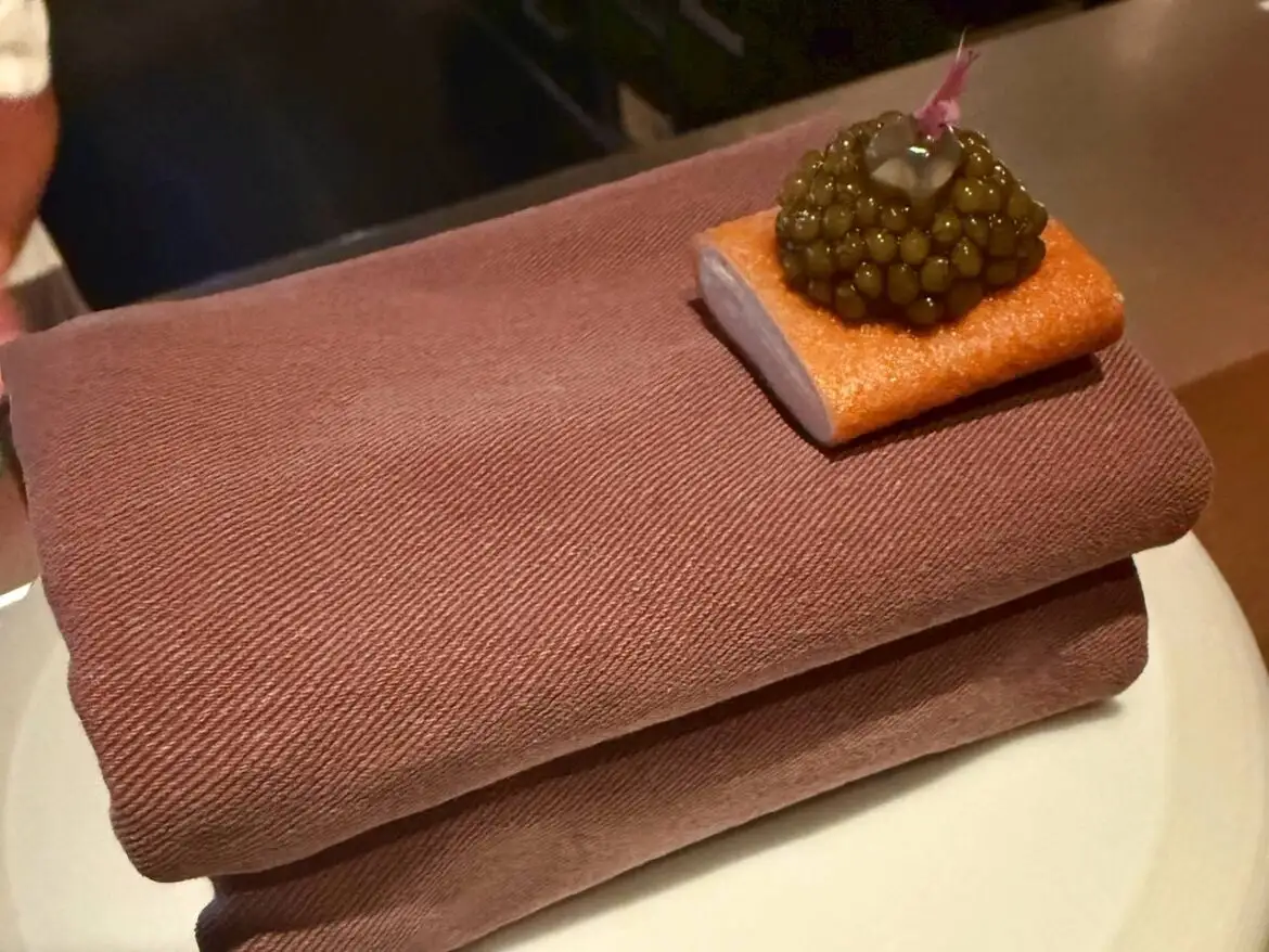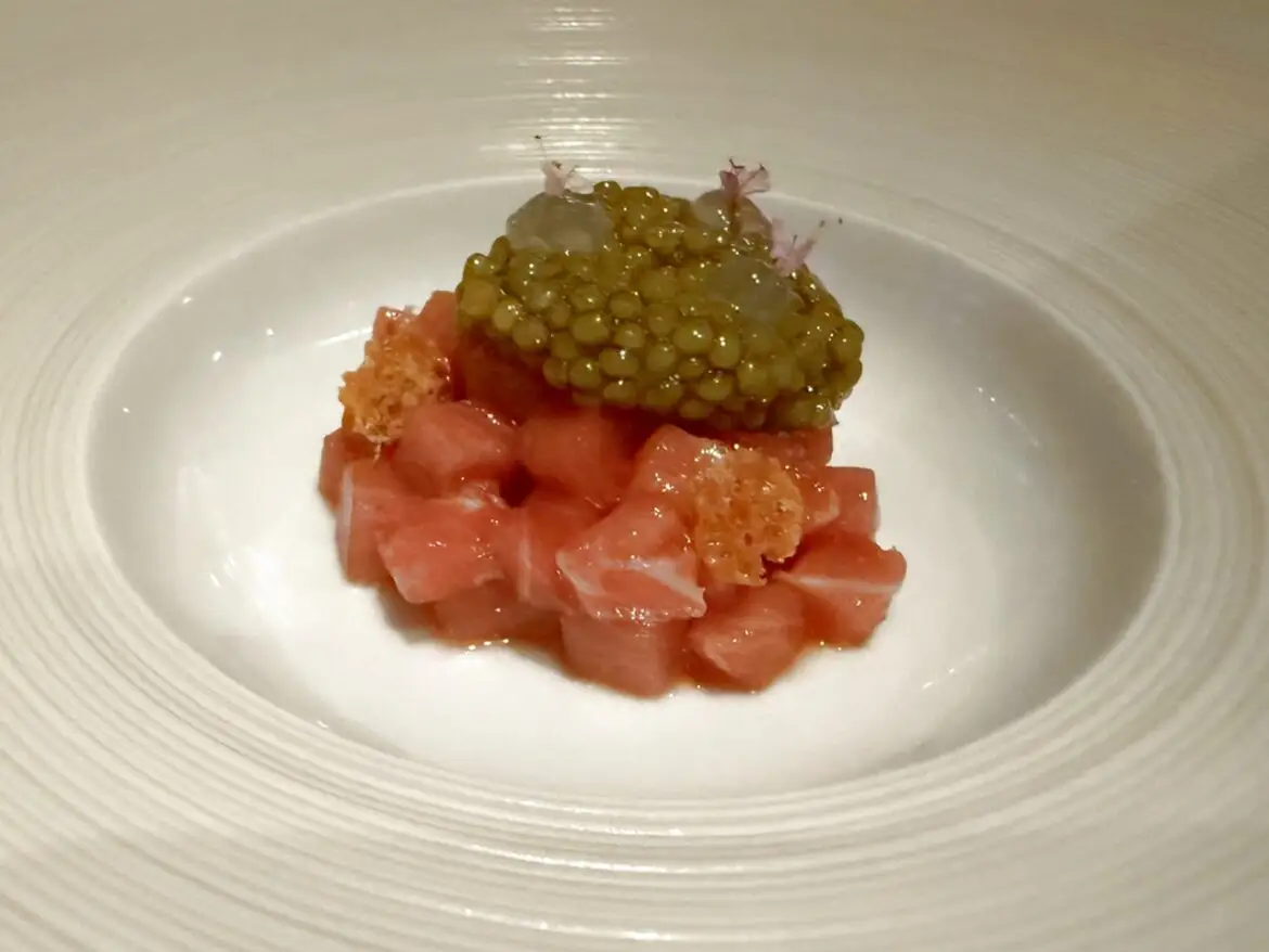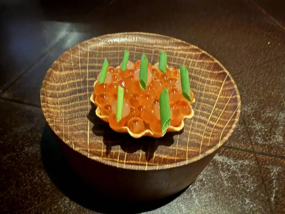 یک تارت کوچک با خاویار ماهی قزلآلای دریایی وحشی از نروژ که با سس سویا و لیمو طعمدار شده بود، در پایهای از خمیر ترد سرو شد. تخمهای رنگارنگ به آرامی در ژل میرین و یوزو مزهدار شده بودند و این پیشغذا با ترکههای کوچک پیازچه تکمیل شد.