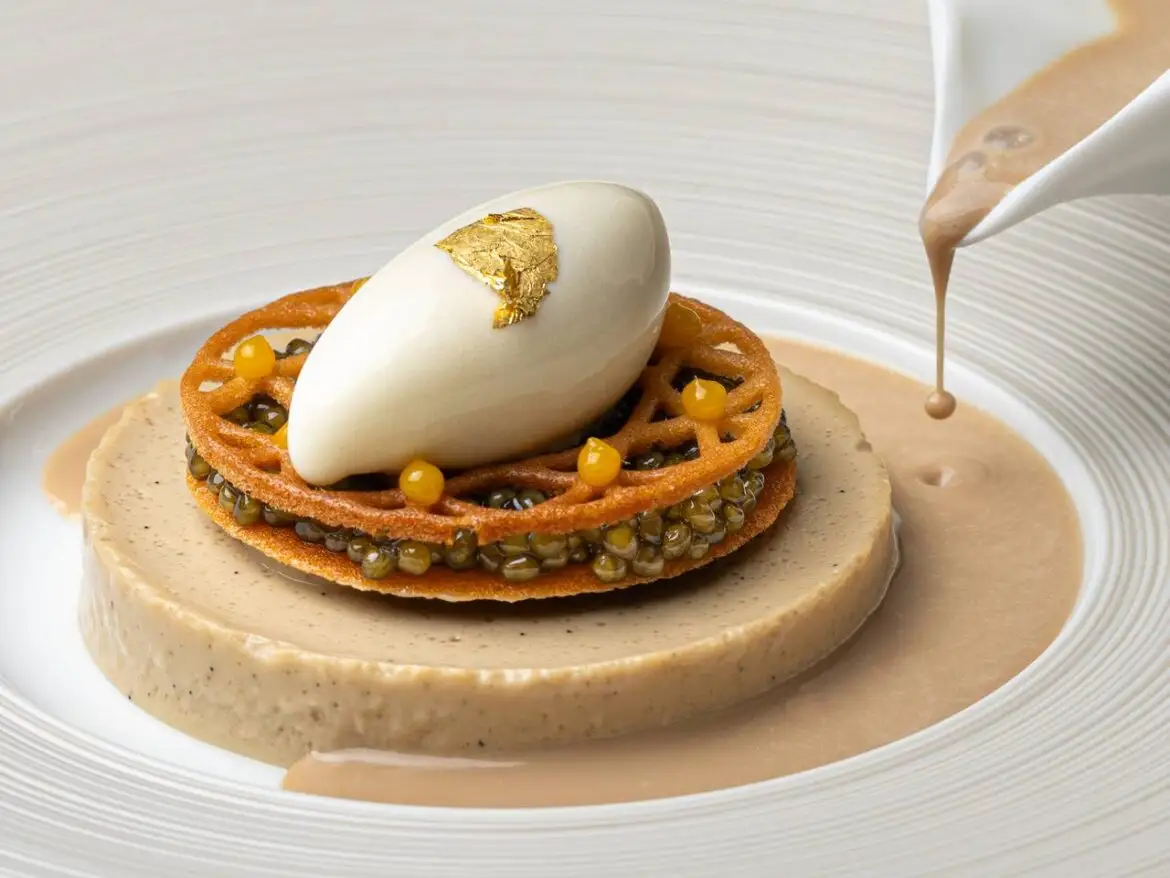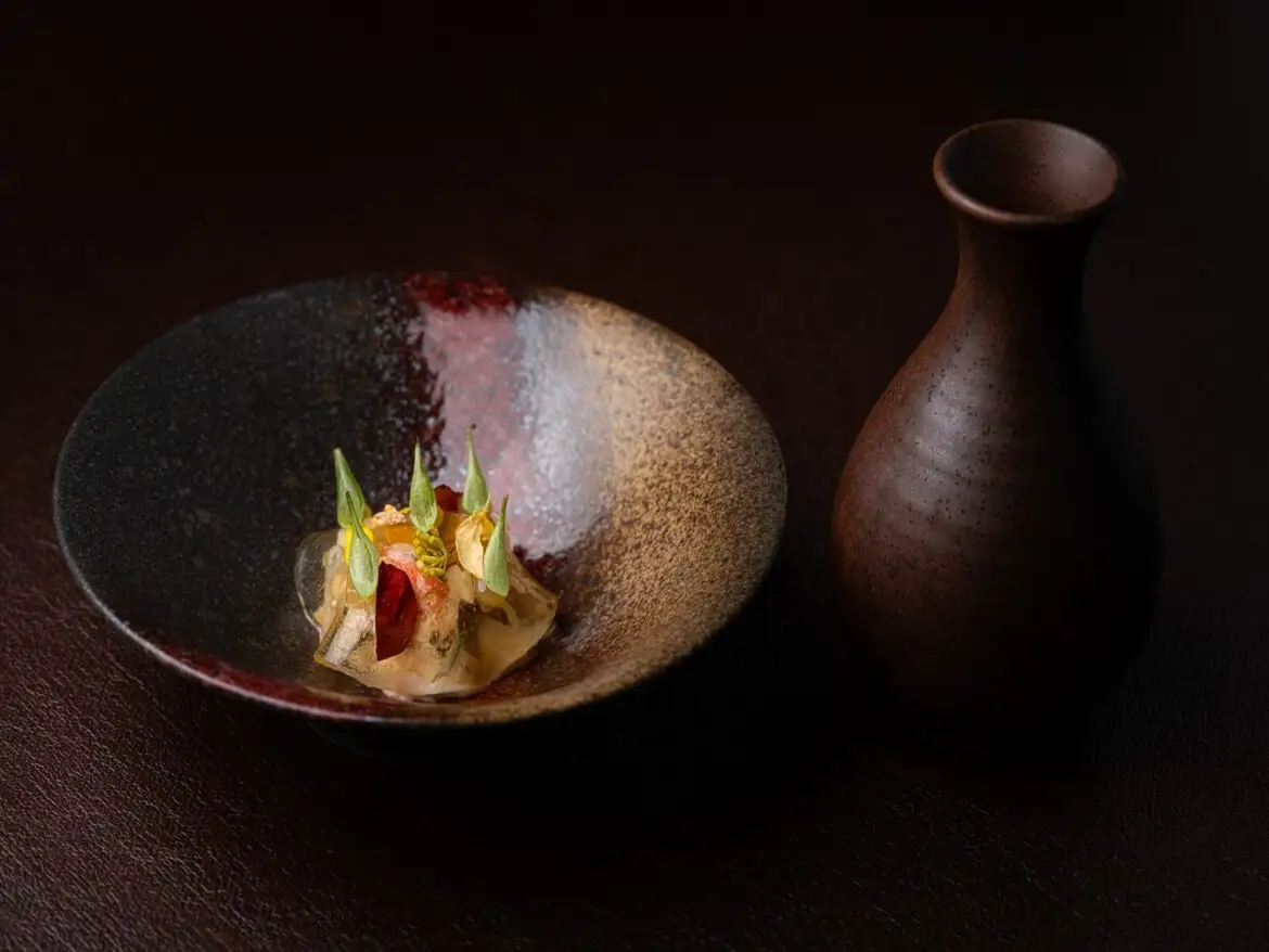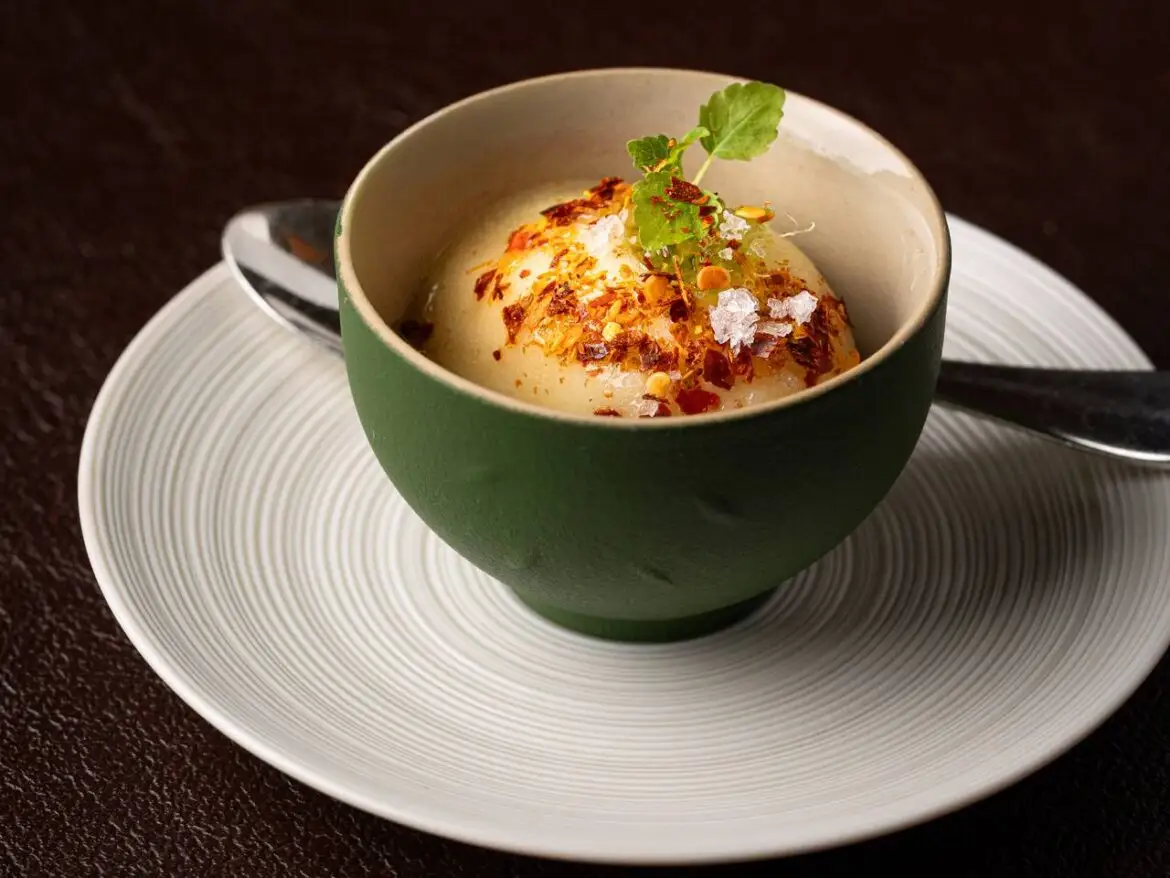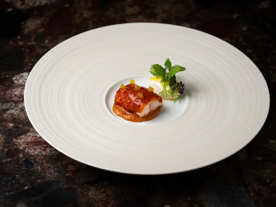 یک تارت کوچک با خاویار ماهی قزلآلای دریایی وحشی از نروژ که با سس سویا و لیمو طعمدار شده بود، در پایهای از خمیر ترد سرو شد. تخمهای رنگارنگ به آرامی در ژل میرین و یوزو مزهدار شده بودند و این پیشغذا با ترکههای کوچک پیازچه تکمیل شد.