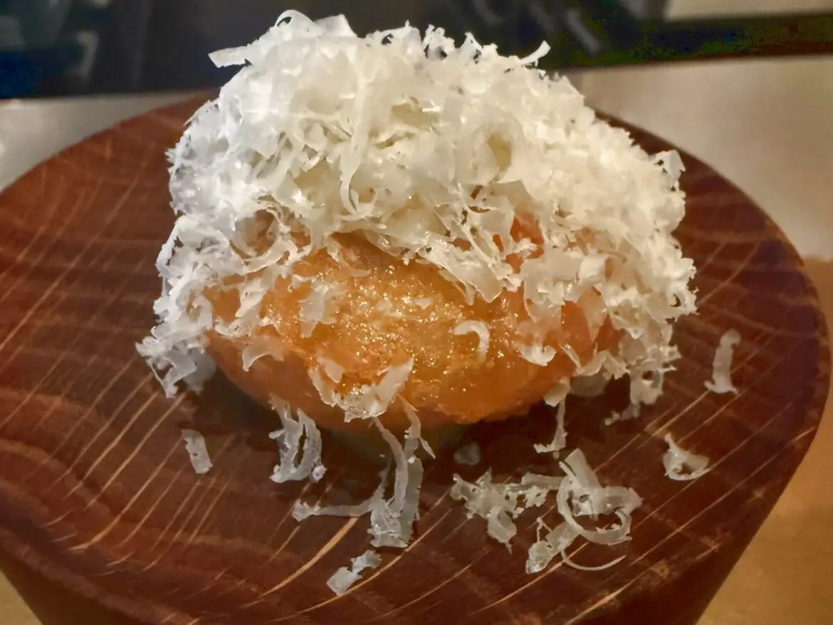 دونات کوچک پر شده با پنیر کومته ۳۶ ماهه و سس قارچ دنبلان سیاه