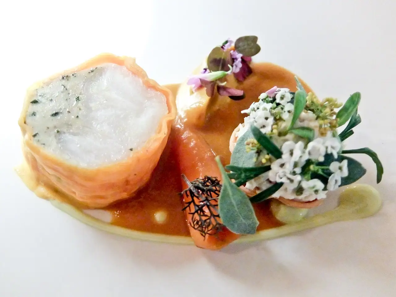 مرحله چهارم، رولت ماهی کاد. ماهی درون یک ورقه هویج پیچیده شده، همراه پوره شلغم و هویج، به علاوه یک هویج کامل با سس عسل و خردل که رویش گیاه لوید قرار دارد. تارتلت ترب کوهی غافلگیری خوبی بود و حس تازهای ایجاد میکرد.
