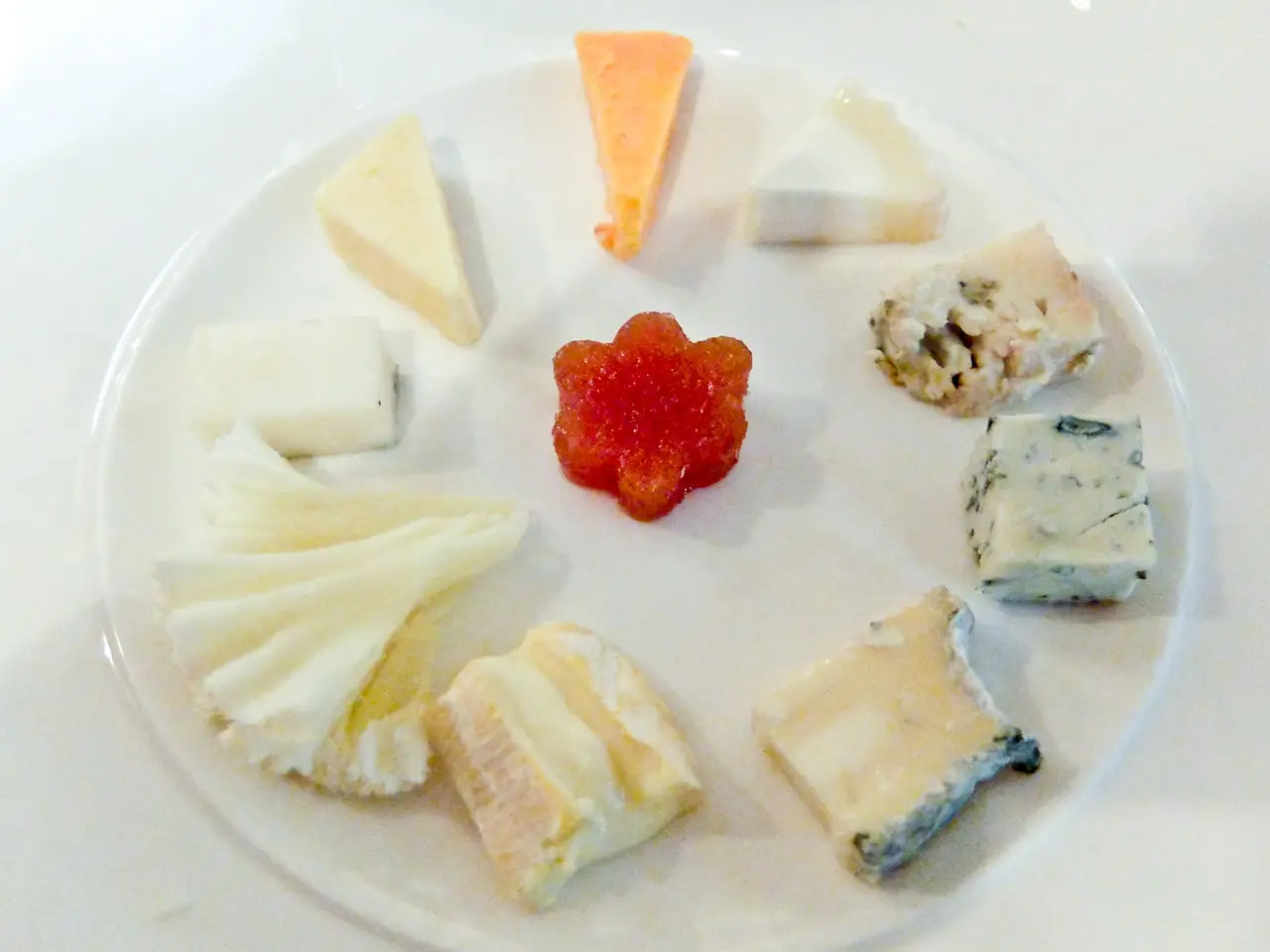 مرحله هشتم، پنیر. یک ساعت پنیر را تصور کنید با ۹ پنیر مختلف به جای اعداد. انتخابی عالی که در دمای کاملاً مناسب سرو شد و همراه با برگهای بود که جزئیات پنیرهای مختلف را شرح میداد. من تقریباً مخلفات آن شامل برشهای سیب، انگور، گلابی خشکشده، بیسکویت و عسل را دست نخورده گذاشتم.