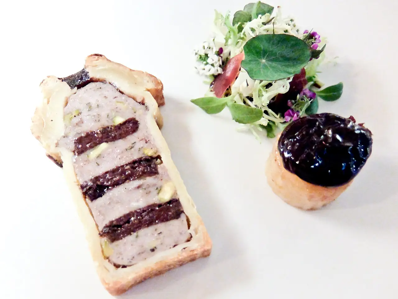 مرحله سوم، گوشت خوک در خمیر. برشی از گوشت شکم خوک در خمیری مرطوب و استوانهای از پوره کرفس که رویش آلو و گردوی ترشی گذاشته شده. شکستن یک پای گوشت خوب سخت است و این یکی از بهترینهاست.