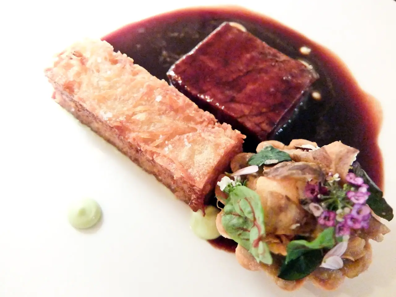 مرحله پنجم، گوشت گاو گالووی. مربعی از گوشت که به خوبی نیمپز شده و در آبگوشتی غنی قرار دارد، همراه با یک برش از سیبزمینی سرخ شده پارمزانی. یک تارتلت دیگر هم اینجا وجود داشت، این بار با کنگر فرنگی و قارچ، که گازی بسیار خوشمزه بود.