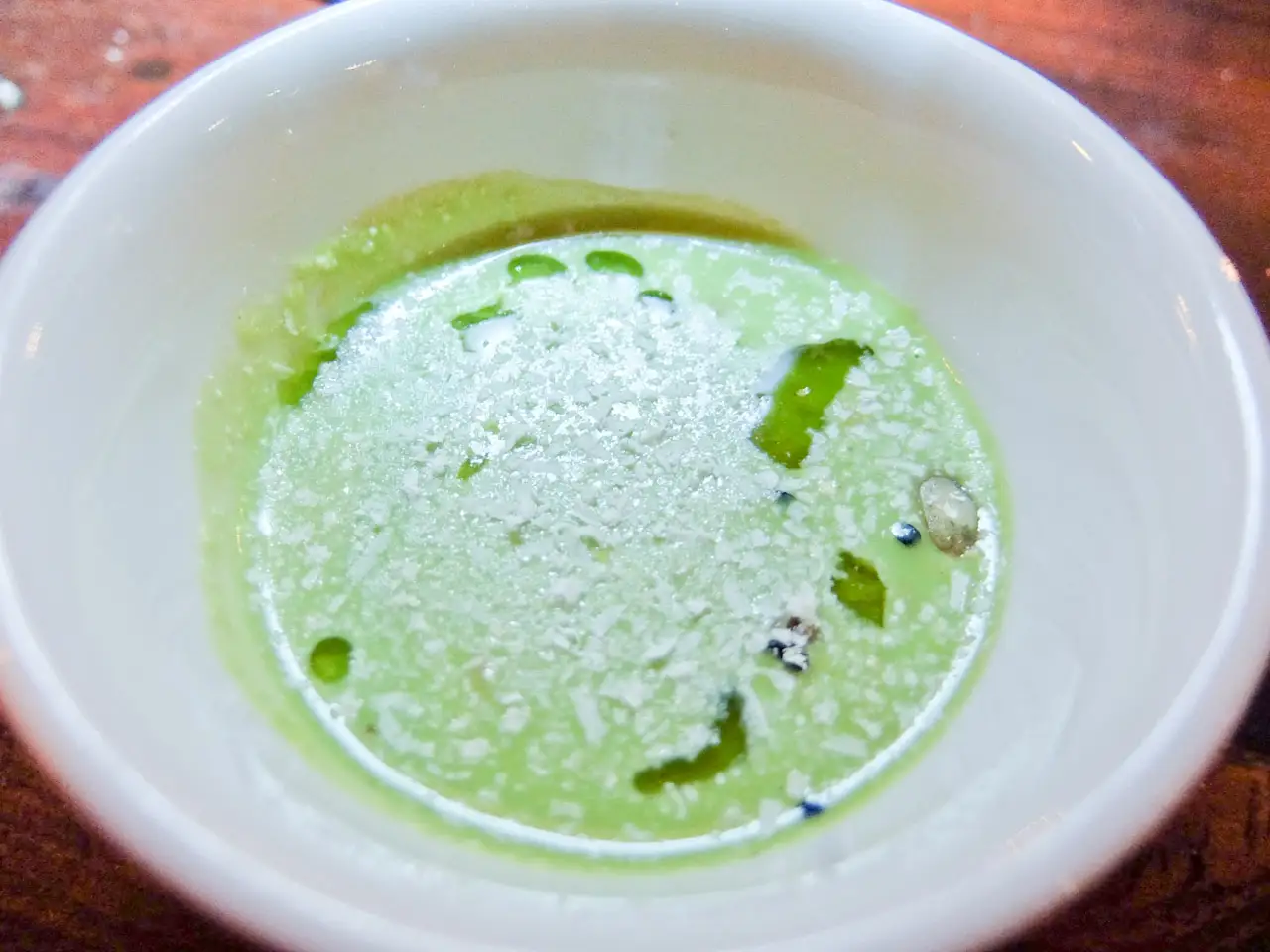 مرحله اول، پیشغذای سبک – گازپاچوی نخودسبز با مقدار زیادی نعنا، پنیر فتا و جو. این غذا به طرز شگفتانگیزی نعنایی بود و جو ترد ته ظرف بافت اضافهای به آن میداد.