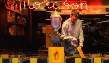 از آنجا، با اندکی پیادهروی به کافه موکابون در دانکرستیگ میرسیم. این کافه متعلق به دهه ۱۹۵۰ میلادی است و گویی در زمان متوقف شده، با تمام جزئیات اولیه از جمله یک پیشخوان چوبی زیبا، دیوارهای قرمز و میزهای کوچک گرد. در ورودی کافه، یک بخش کوچک برای فروش دانههای قهوه است که خودشان برشته میکنند (از اواخر دهه ۱۹۳۰ این کار را انجام میدهند) و در بستههای کاغذی متمایز زردرنگ و قرمزرنگ عرضه میشوند.