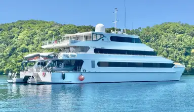 فورسیزنز اکسپلورر پالائو همواره در قلب این چشماندازهای آبی و سبز پهلو میگیرد. این قایق کوچک شناور که ترکیبی از یک هتل لوکس و یک کشتی اقامتی غواصی است، توضیحش برای کسانی که با آن آشنا نیستند، تقریباً به دشواری توضیح موقعیت جغرافیایی پالائو است. دقیقاً یک سفر دریایی معمولی نیست، اما یک هتل شناور ثابت هم محسوب نمیشود.