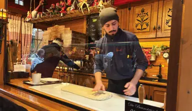 ما در برابر وسوسه این شیرینی استوانهای که با پوششی به انتخاب مشتری سرو میشد، مقاومت نکردیم؛ ما شکر و دارچین را انتخاب کردیم که مکمل عالی پوسته ترد و داخل جویدنی این دسر اروپای شرقی بود. با حیرت تماشا کردیم که یک مرد خمیر را روی میز کار میگذارد، آن را به نوارهای بلند برش میزند، پهن میکند و دور یک سیخ چوبی میپیچد. قبل از قراردادن کیکها در فر، او آنها را با روغن یا کره آغشته و سپس در شکر میغلطاند تا روی شعله کاراملی شود.