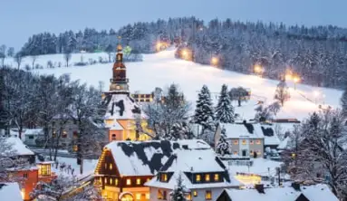 نزدیک مرز جمهوری چک، زایفن شاید در جهان آلمانیزبان به عنوان «خانه کریسمس» شناخته شده باشد، اما تاکنون عمدتاً از نگاه گردشگران فصلی انگلیسیزبان دور مانده است. این روستا در دل کوههای ارتس، حدود یک ساعت و نیم جنوب درسدن، پنهان شده و دسترسی به آن با وسایل نقلیه عمومی آسان نیست — نزدیکترین ایستگاه قطار در اولبرنهاو، تقریباً ۱۱ کیلومتر دورتر است. اتوبوس موجود است، اما ما ماشین اجارهای انتخاب میکنیم و راهی تپهها میشویم و روز پس از نخستین بارش برف سال میرسیم. جادهها به سرعت پاک شده، اما برف به شاخههای درختان کاج چسبیده است. نیمهنگام منتظریم فرزند گروفالو را ببینیم، اما فقط یک روباه به رنگ زنگار میبینیم که از میان دشتی تازه از برف میگذرد.