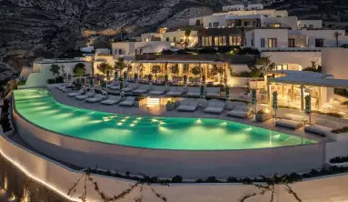 طراحی این مجموعه با هدف ایجاد هماهنگی بین فضاهای داخلی و خارجی انجام شده است. هر اتاق به تراس خصوصی رو به استخر یا دریای اژه باز میشود، و تقریباً یک سوم اتاقها دارای استخر اختصاصی هستند. برای کسانی که به دنبال اوج انزوا هستند، سه ویلای انحصاری حریم خصوصی و تجمل بینظیری را ارائه میدهند. منطقه ساحلی اختصاصی این اقامتگاه دسترسی آسان به خط ساحلی جزیره و آرامش لذتبخش کنار دریا را فراهم میکند. امکانات رفاهی و سلامتی تجربه اقامت را ارتقا میبخشد، از جمله دو استخر بیکران، یک اسپای آرامشبخش با سونا و استخر سرپوشیده، یک استودیوی تناسب اندام دو طبقه، و یک باغ یوگای آرام برای رویکردی جامع به سلامتی. کشف طعمهای جدید و ارتباطات اجتماعی در قلب این مجموعه قرار دارد. یک رستوران ویژه و یک مکان غذاخوری تماموقت که توسط Rockwell Group طراحی شدهاند، از مهمانان دعوت میکنند تا از طعمهای متنوع لذت ببرند، در حالی که یک بار شراب، مکانی عالی برای چشیدن شرابهای افسانهای سانتورینی ارائه میدهد. با یک کلاب کودکان اختصاصی، خانوادهها به خوبی مورد توجه قرار میگیرند، و مجموعهای منتخب از بوتیکهای لوکس، پیشنهاد سبک زندگی اقامتگاه را تکمیل میکند و تجربهای بیدردسر و لوکس را از بدو ورود تا خروج برای همه تضمین میکند.